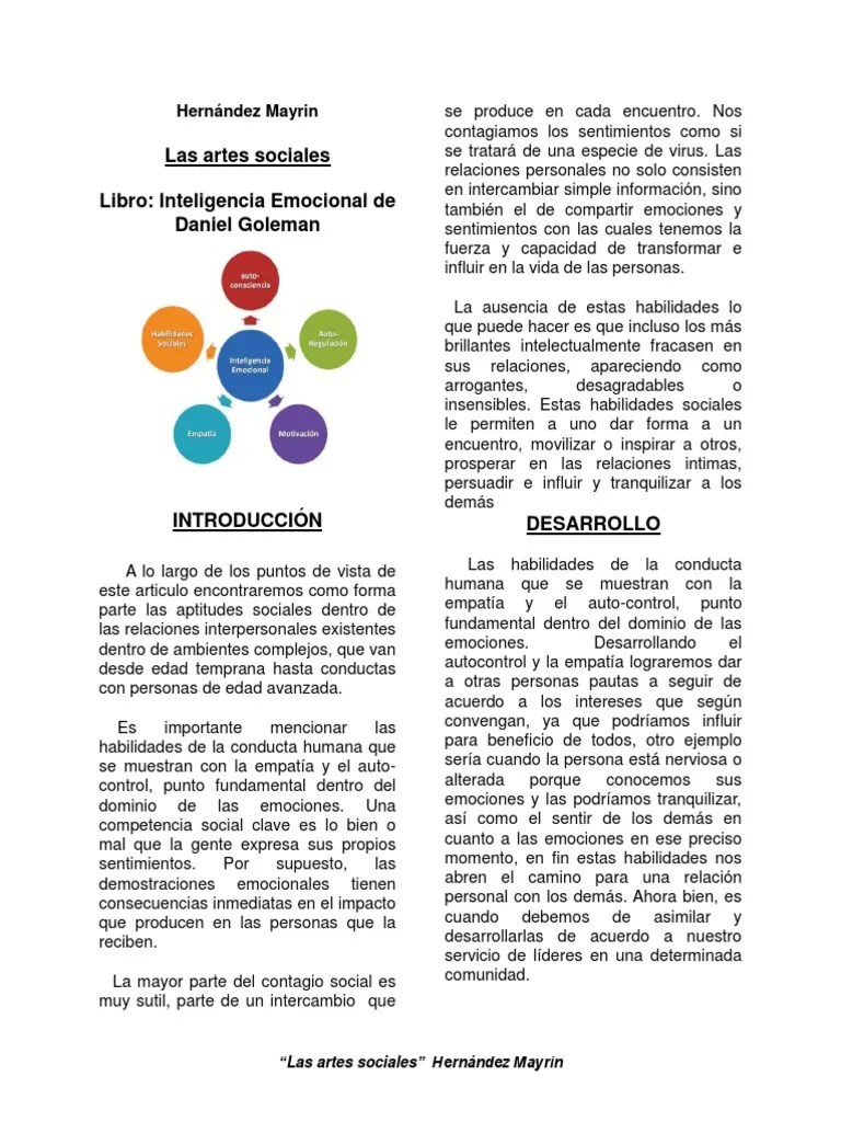 Los seres humanos somos por naturaleza artistas, por ende, el origen del arte comienza con el origen de la humanidad... Aquí los déficits conducen a la ineptitud en el mundo social o a los desastres. Inteligencia emocional de daniel goleman introduccin a lo largo de los puntos de vista de este articulo encontraremos como forma parte las aptitudes sociales dentro de las relaciones interpersonales existentes dentro de ambientes complejos, que van desde edad temprana hasta conductas con personas de edad avanzada. Los seres humanos somos por naturaleza artistas, por ende, el origen del arte comienza con el origen de la humanidad. Las artes sociales la capacidad de conocer los sentimientos de otro y de actuar de una manera que de nueva forma a esos sentimientos. Ser capaz de manejar las emociones que de nueva forma a esos sentimientos.ser capaz de manejar las emociones de otro es la esencia del arte de mantener relaciones. Hernndez mayrin las artes sociales libro: Las artes sociales hernndez mayrin. La capacidad creativa pertenece a una comunidad, a un grupo con visiones y talentos diferentes que comparten el mismo contexto social donde viven las mismas riquezas y carencias. Las artes sociales la capacidad de conocer los sentimientos de otro y de actuar de una manera que de nueva forma a esos sentimientos.